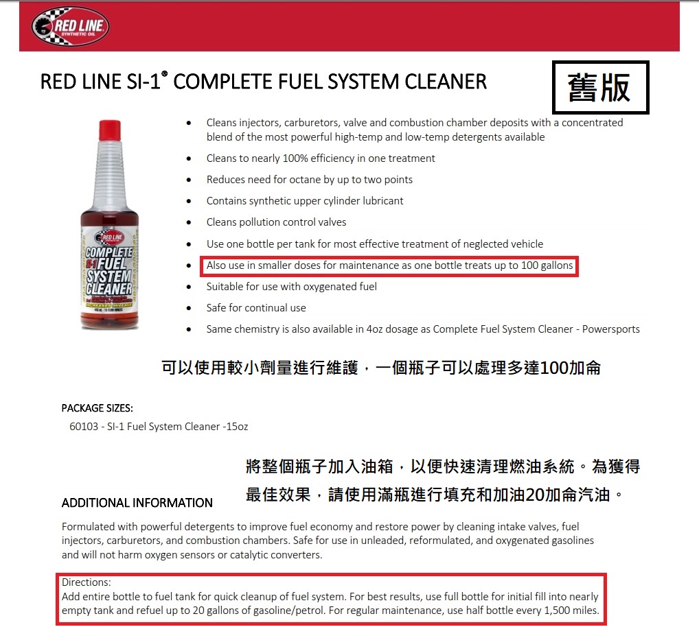 RED LINE SI-1 FUEL SYSTEM CLEANER全效汽油精 新包裝