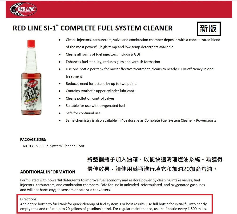 RED LINE SI-1汽油添加劑:促進燃油燃燒效率,清除管路積碳,